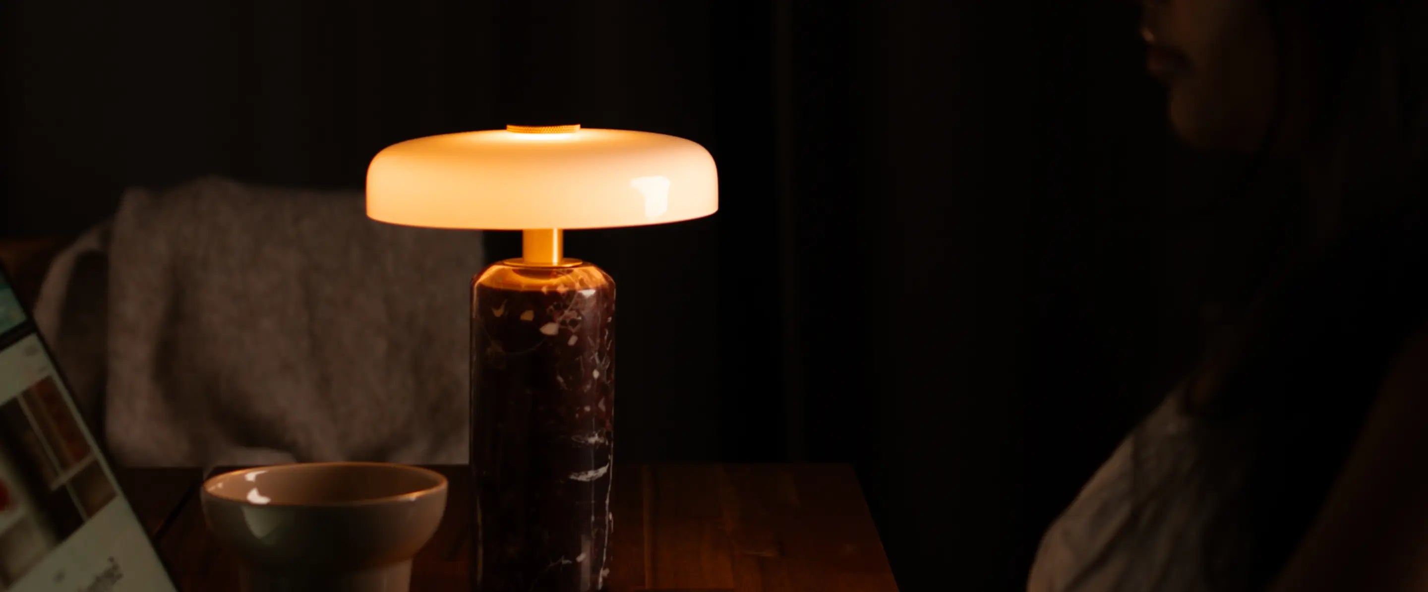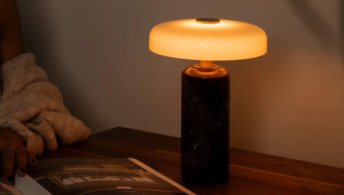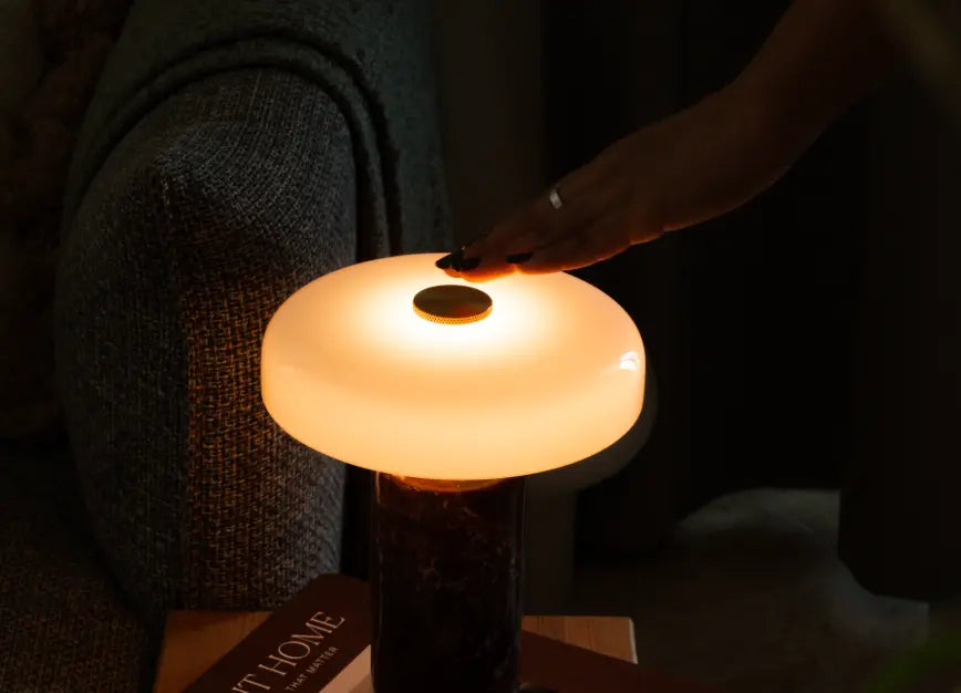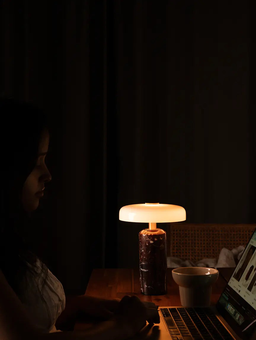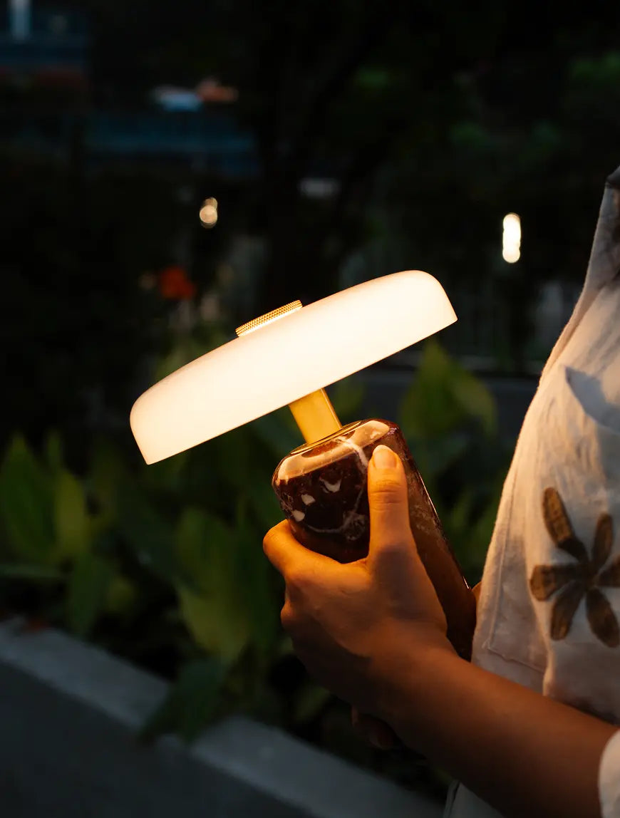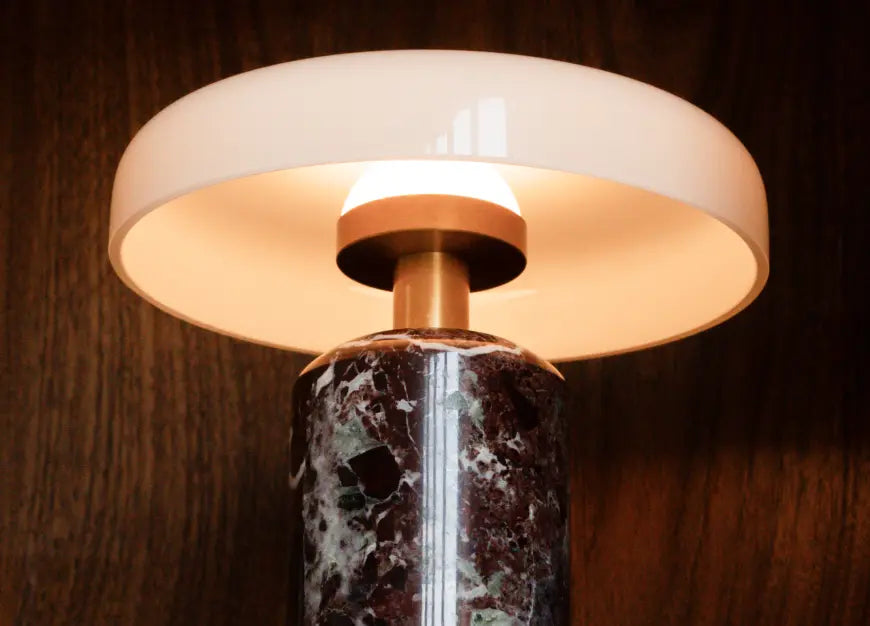 Alba Burgundy Marble Portable Table Lamp offers warm light with 3-level touch dimming and cordless ease. Crafted with a burgundy marble base and white glass shade, it delivers 8-10 hours of ambient glow.