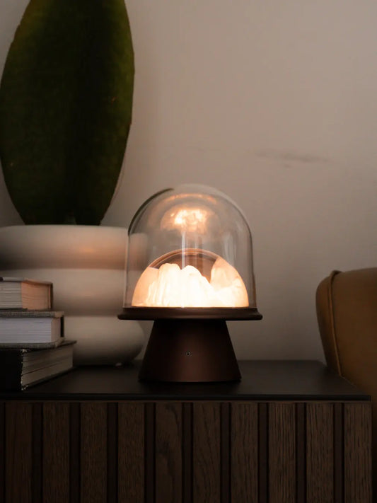 The Dawn Glass Table Lamp blends warm orange-brown glass with a metal base, dimmable glow, and remote control. A premium, modern lamp that brings versatile style, comfort, and mood to any room.