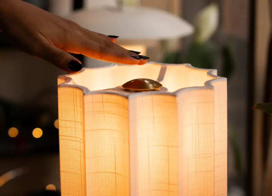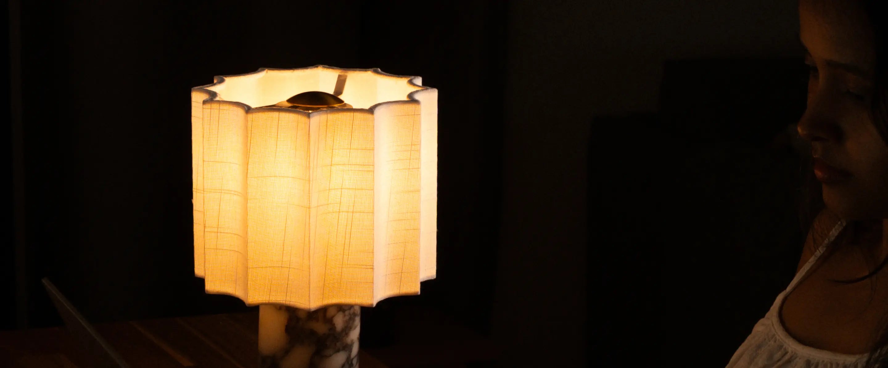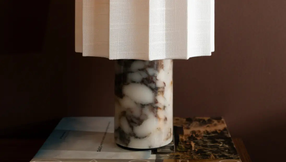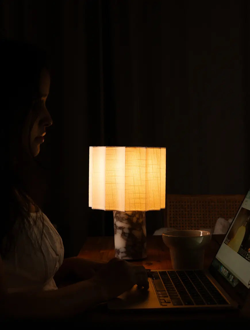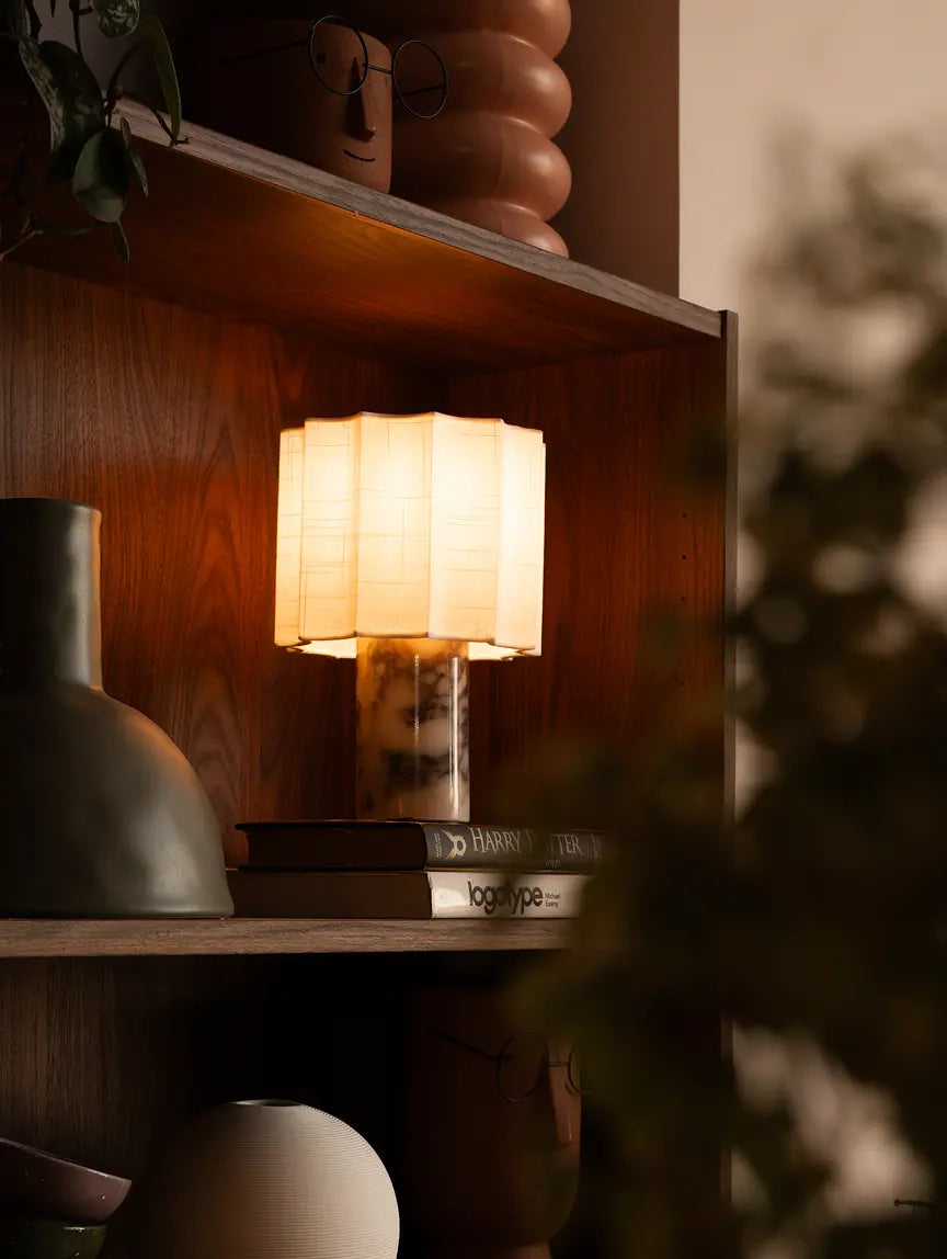 Haze Marble Portable Table Lamp pairs sculpted marble with a soft fabric shade. Touch-dimmable warm LED creates a calm glow, while cordless rechargeability lets you style cozy light anywhere.
